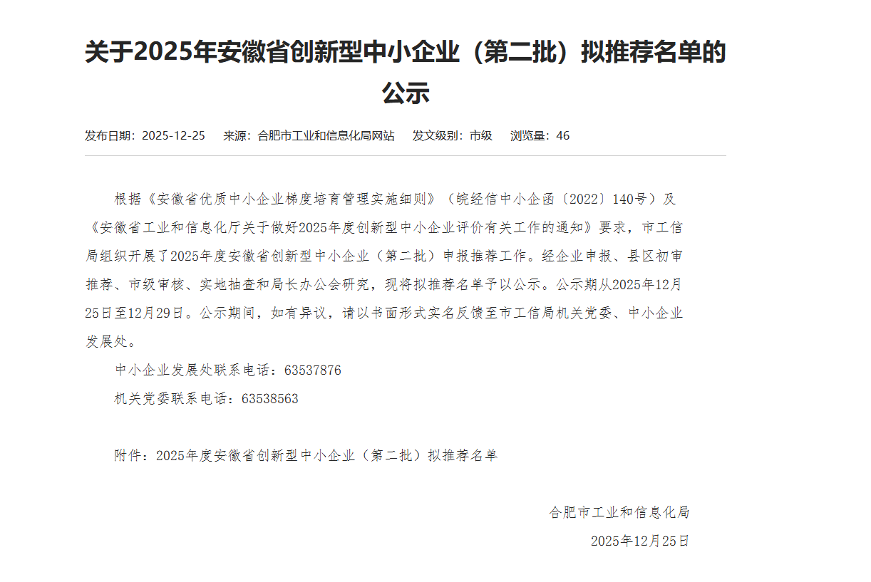 喜訊 | 祝賀我司榮獲2025年度安徽省“創新型中小企業”稱號